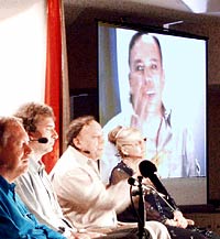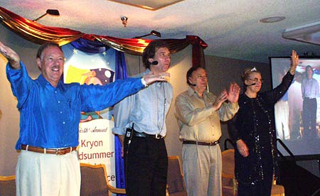 Above: What was advertised as a "tri-channel" became a surprise "quad-channel" with the addition of Ronna Herman! From right to left: Ronna Herman (Archangel Michael), Steve Rother (The Group), Geoff Hoppe (Tobias), and Lee Carroll (Kryon) |