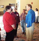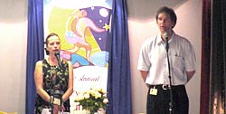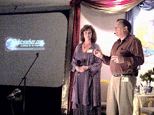 Setting up (above right). The 6th Annual Kryon conference officially began on Friday morning (below) with a greeting from our hosts, Linda Benyo and Geoff Hoppe. The Marriott Courtyard Hotel in Santa Fe, New Mexico, was again the venue. Musicians Stacy Frank (Guitar) and Peter Sterling (harp), supplied music all three days. Special musical guest was Robert Coxon.